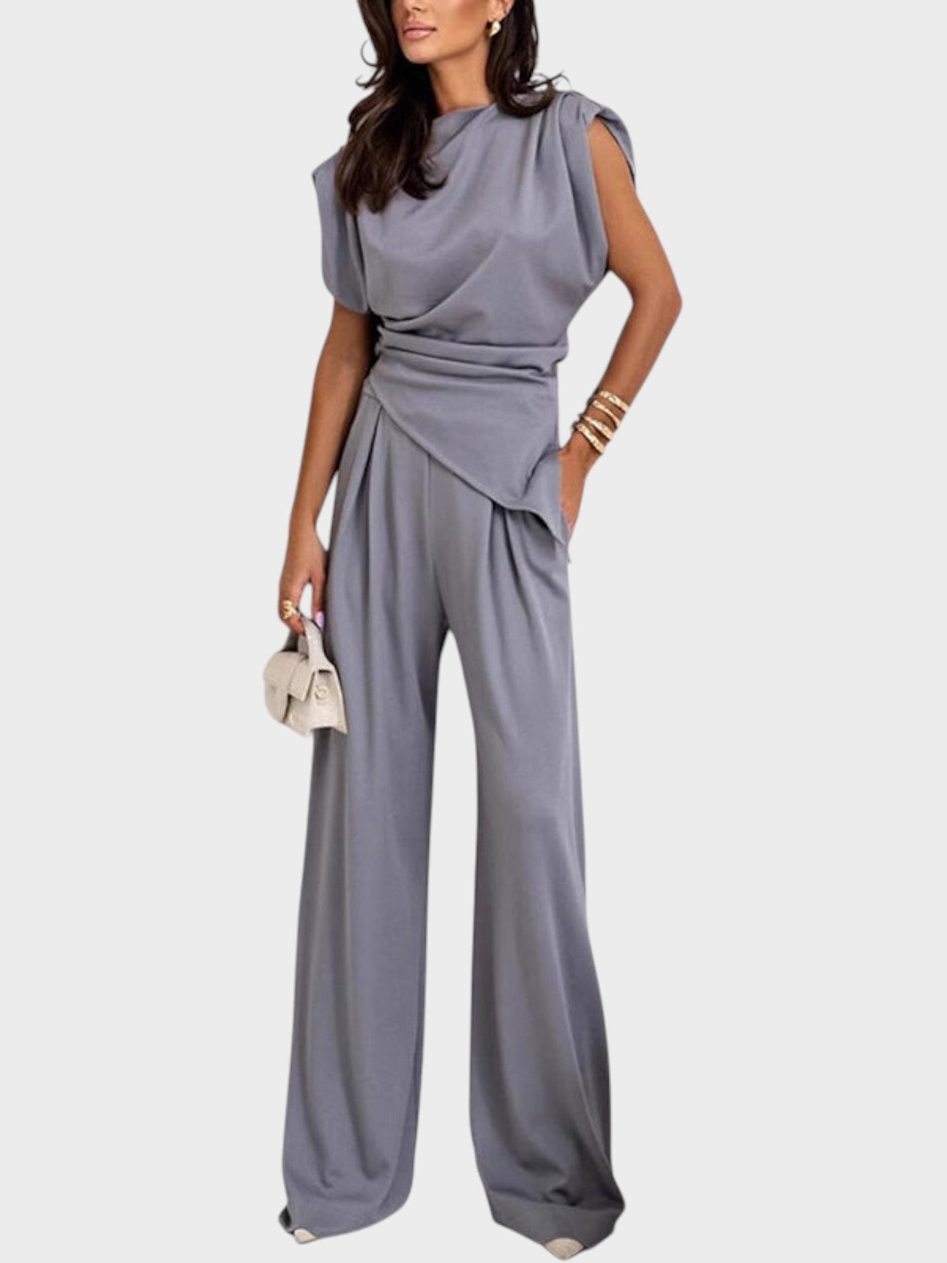 Elevate your look with a beautifully coordinated set designed for timeless elegance and easy comfort. The refined top features flattering draping and a waist-enhancing shape, while the wide-leg trousers create a smooth, elongated silhouette. Perfect for dinners, events, or polished everyday wear with minimal effort.